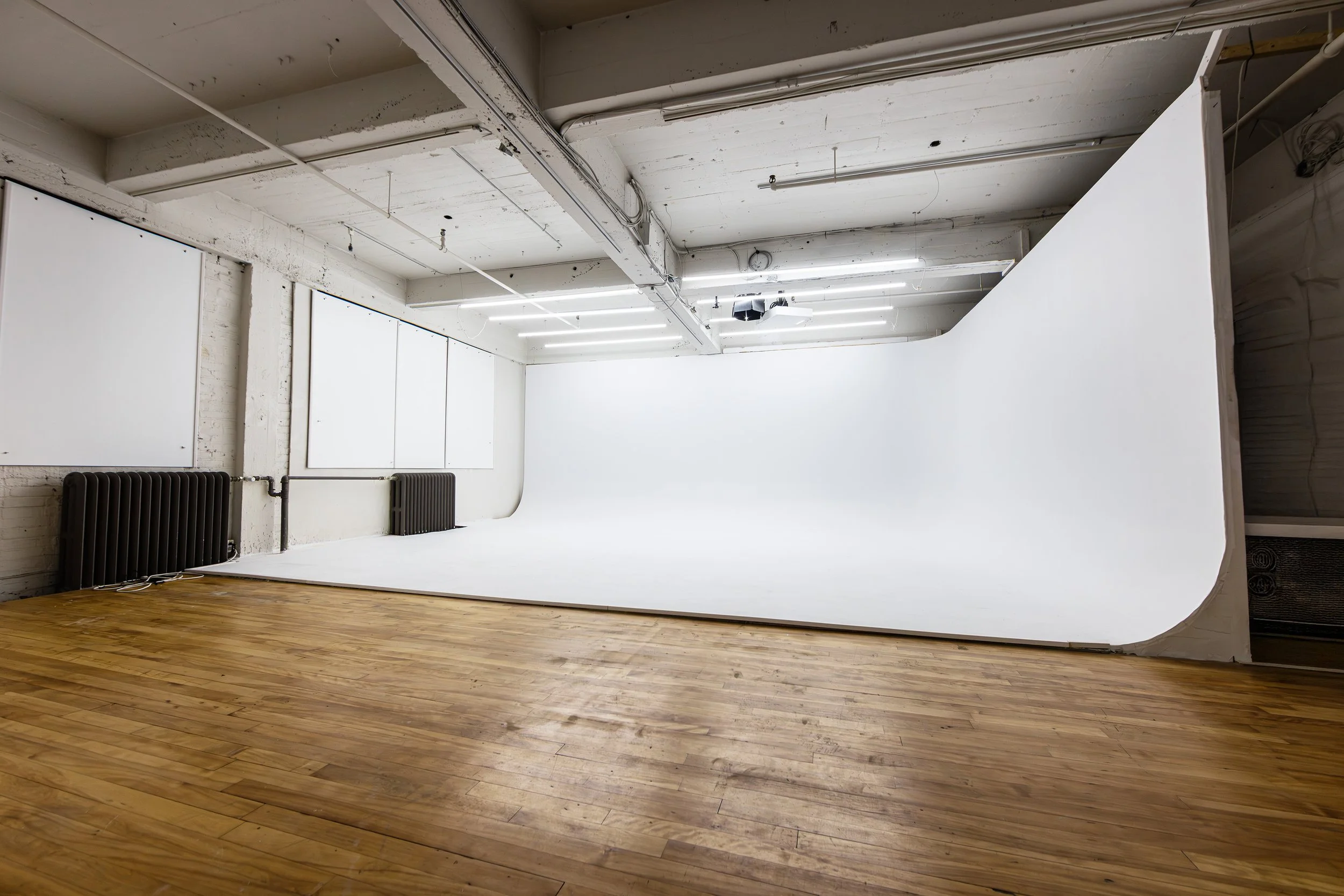 White Cyclorama Walls: Two seamless white walls create a clean, modern environment ideal for portraits, product photography, commercial work, and creative projects.